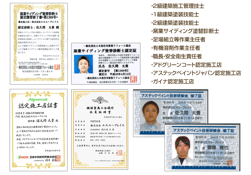 以下は、私個人や会社で持っている資格や許可書、認定施工店です。
