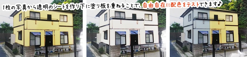 そこで、私どもでは、お家のスケルトンシートを作り、その下に実際の塗料を塗った板を重ねて色をシミュレーションします。この方法で色選びをするようになってから、完成後の色による不満は0になりました。