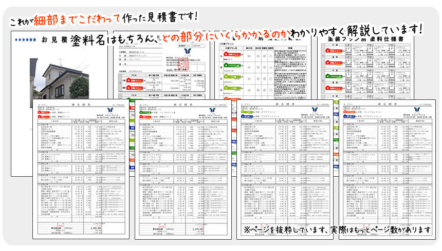どのような塗料があるかわからないお客様も多いので、3~5パターンの見積書を作り、塗料別に特徴などをご説明させていただきます。