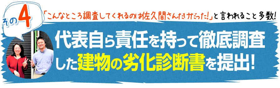 この診断は重要なので、代表の私自ら責任を持って行います。他社では、家の周りを簡単に見て10~20分で終わらす会社もありますが、私の場合はお客様の要望を聞く時間も入れると1時間前後になります。