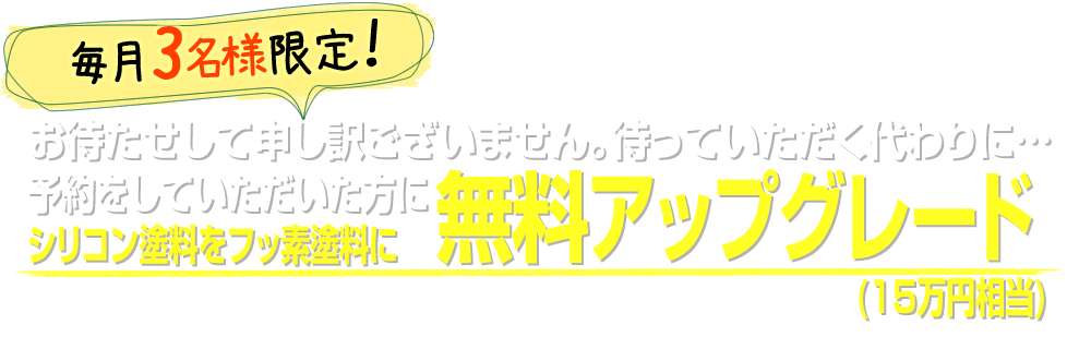そのため、待たせてしまう謝罪の意味も込めまして、今見積もり依頼をして、その後に施工の予約をしていただいたお客様には、シリコン系塗料からフッ素塗料に無料でアップグレードさせていただきます。通常だと塗料をアップグレードすると15万円ほどかかります。